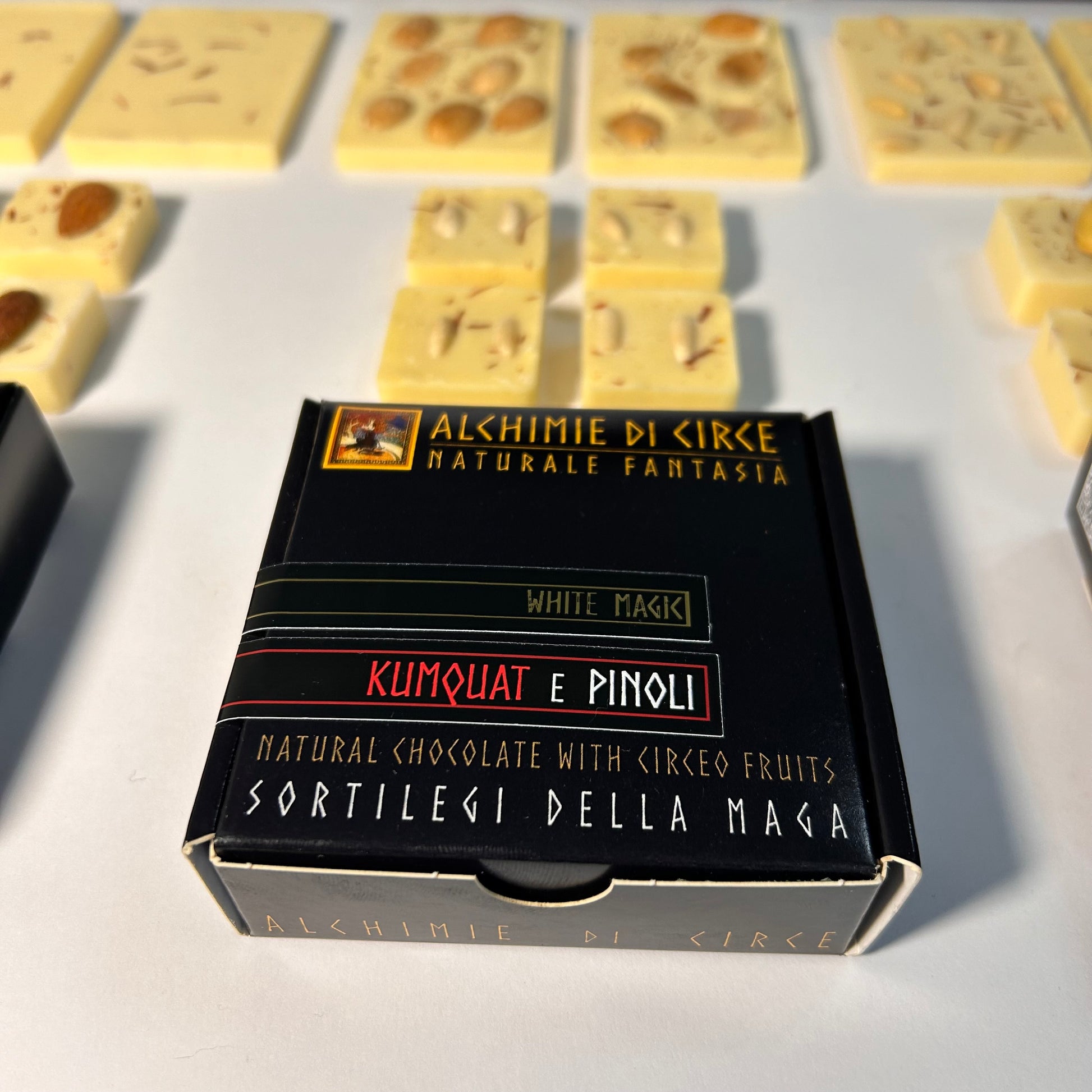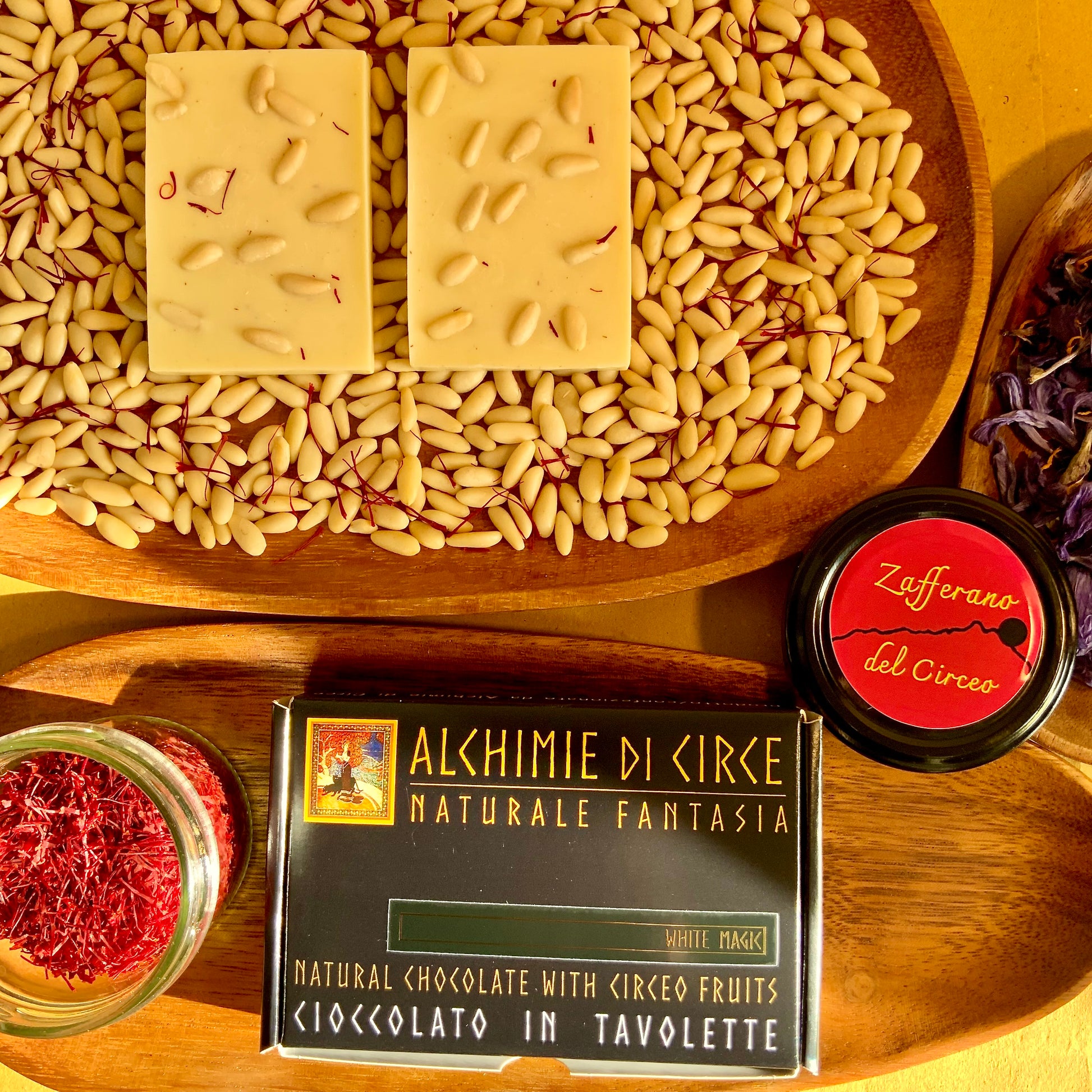 - Cioccolato bianco low sugar selezione Svizzera Cocoa Horizons, - Zafferano del Circeo puro in stimmi, - Zucchero Integrale di Canna Biologico - var. Demerara, - Zucchero Integrale di Canna Bio - var. Dulcita, - Mandarini naturali (Alchimie di Circe - Circeo), - Limoni Naturali (Alchimie di Circe - Circeo), - Kumquat (mandarini cinesi)naturali (Alchimie di Circe - Circeo), - Mandorla di Toritto (Slow Food - Puglia), - Pistacchi di Sicilia et - Pinoli dell' Agro Pontino (LT)
